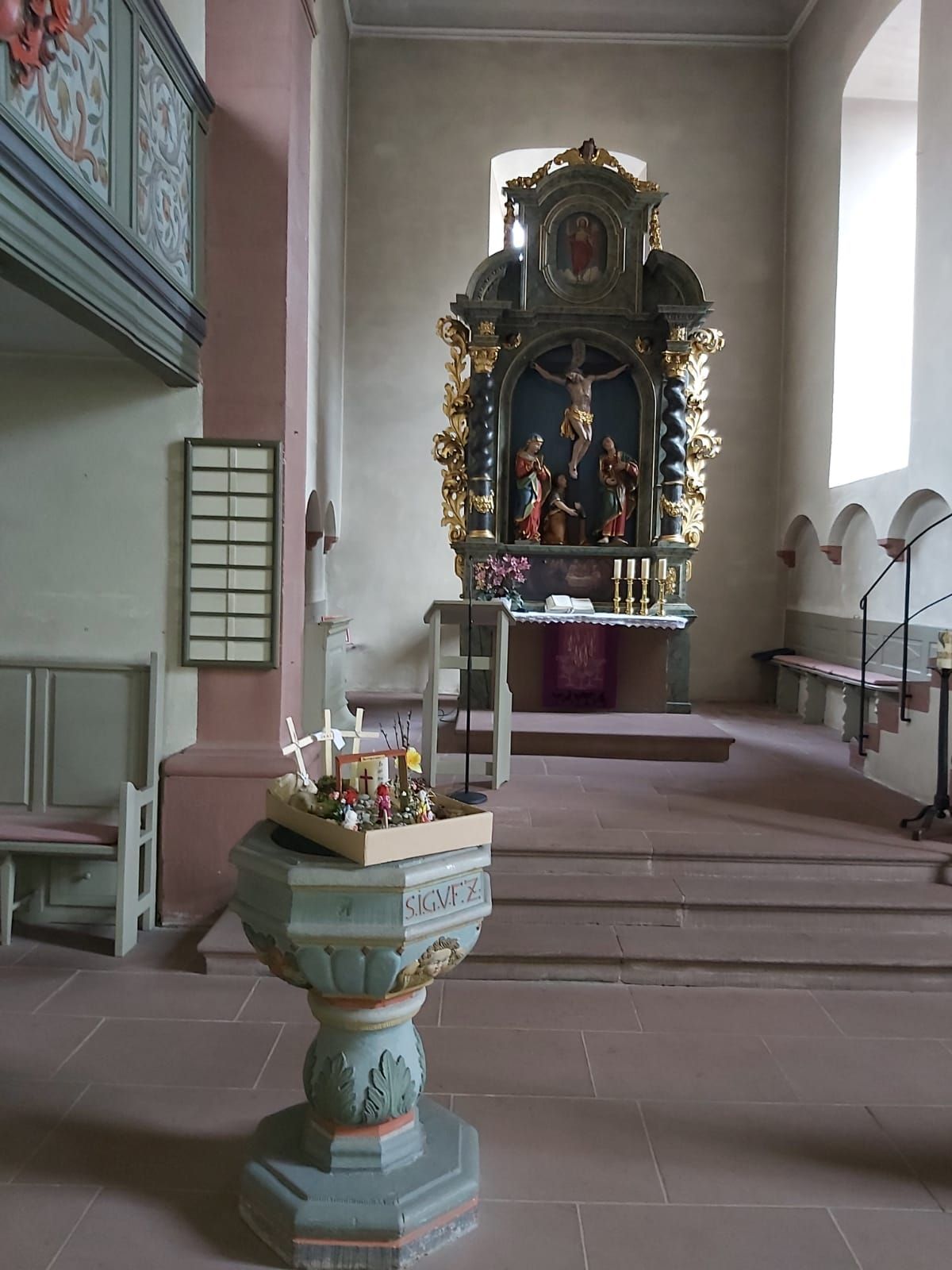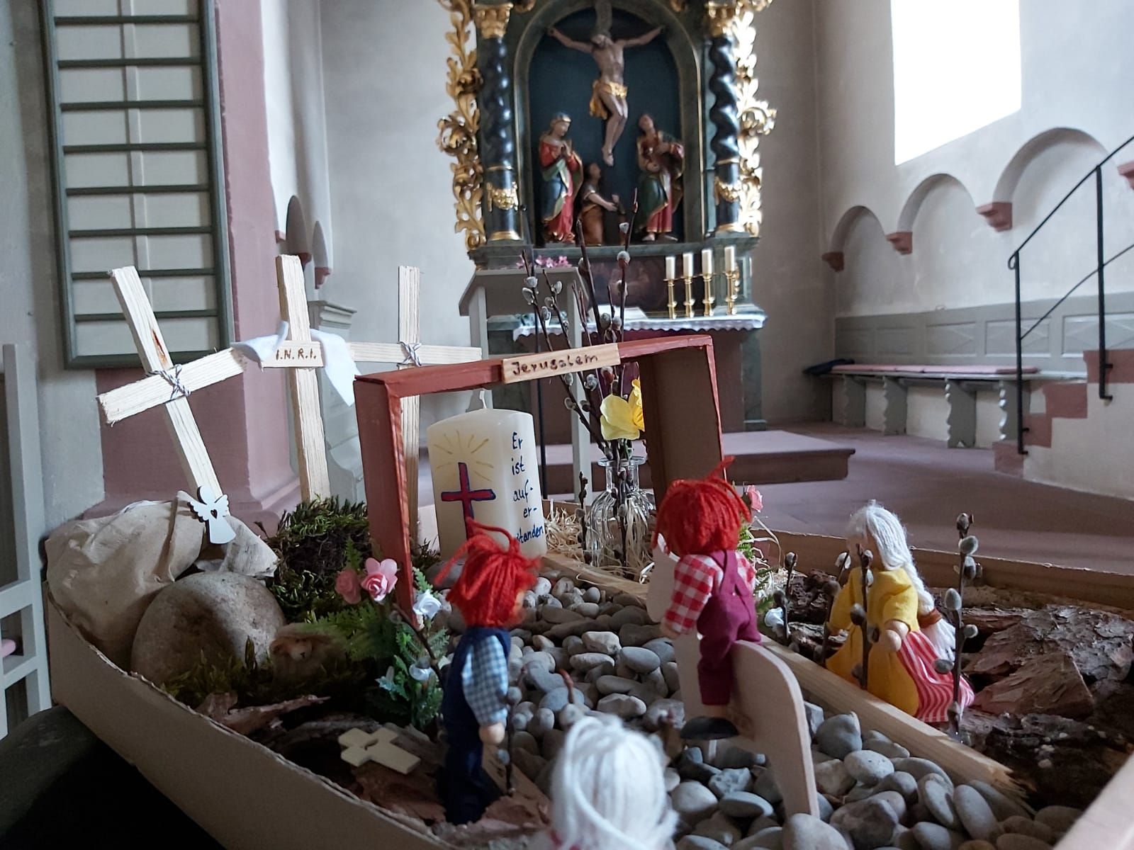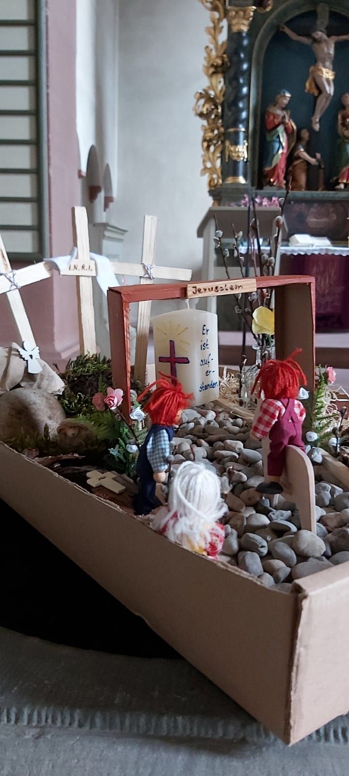Auf dem Bild oben seht Ihr den Ostergarten in der Kirche, den Elena und Daniela Pfau in der Kirche gestaltet haben.