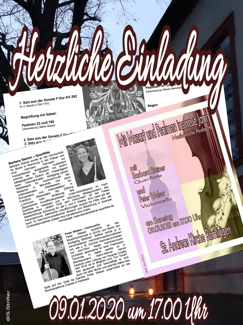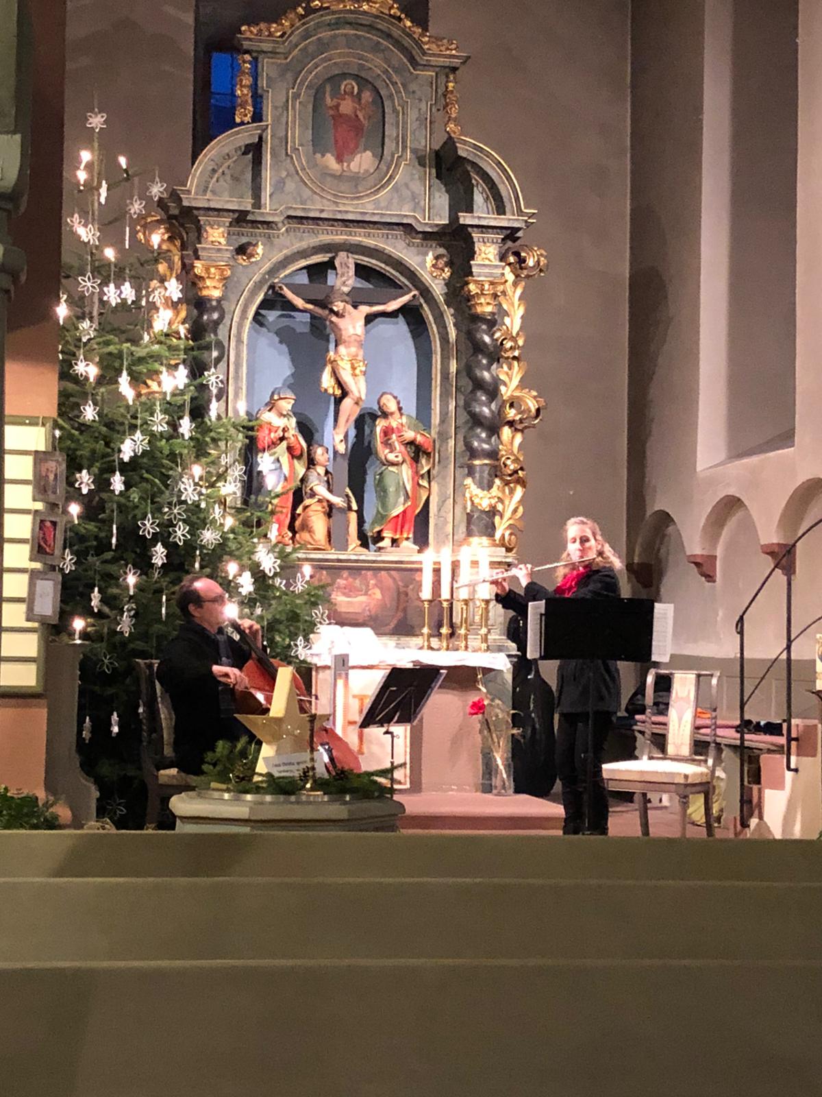 Mit dem ersten Satz aus der Sonate F Dur von Mozart eröffneten Barbara Steiner und Peter Walser die musikalische Andacht. Pfarrerin Mirlein begrüßte danach die ungefähr 40 Besucher mit Psalm 23 und 150 - in einer besonderen Übersetzung von Martin Buber. Der zweite und dritte Satz der Sonate folgten, außerdem die Goldbergvariationen von J.S. Bach sowie Adagio, Allegro, Largo aus der Recercata 1 von G.B. Platti.