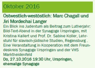 Unser Jubiläumsjahr startete mit einem Bild-Text-Abend in der ehemaligen Synagoge in Urspringen. Kristina Kallert und Prof. Dr. Sabine Koller präsentierten Werke von Marc Chagall in Kombination mit Texten von Jiri Mordechai Langer.