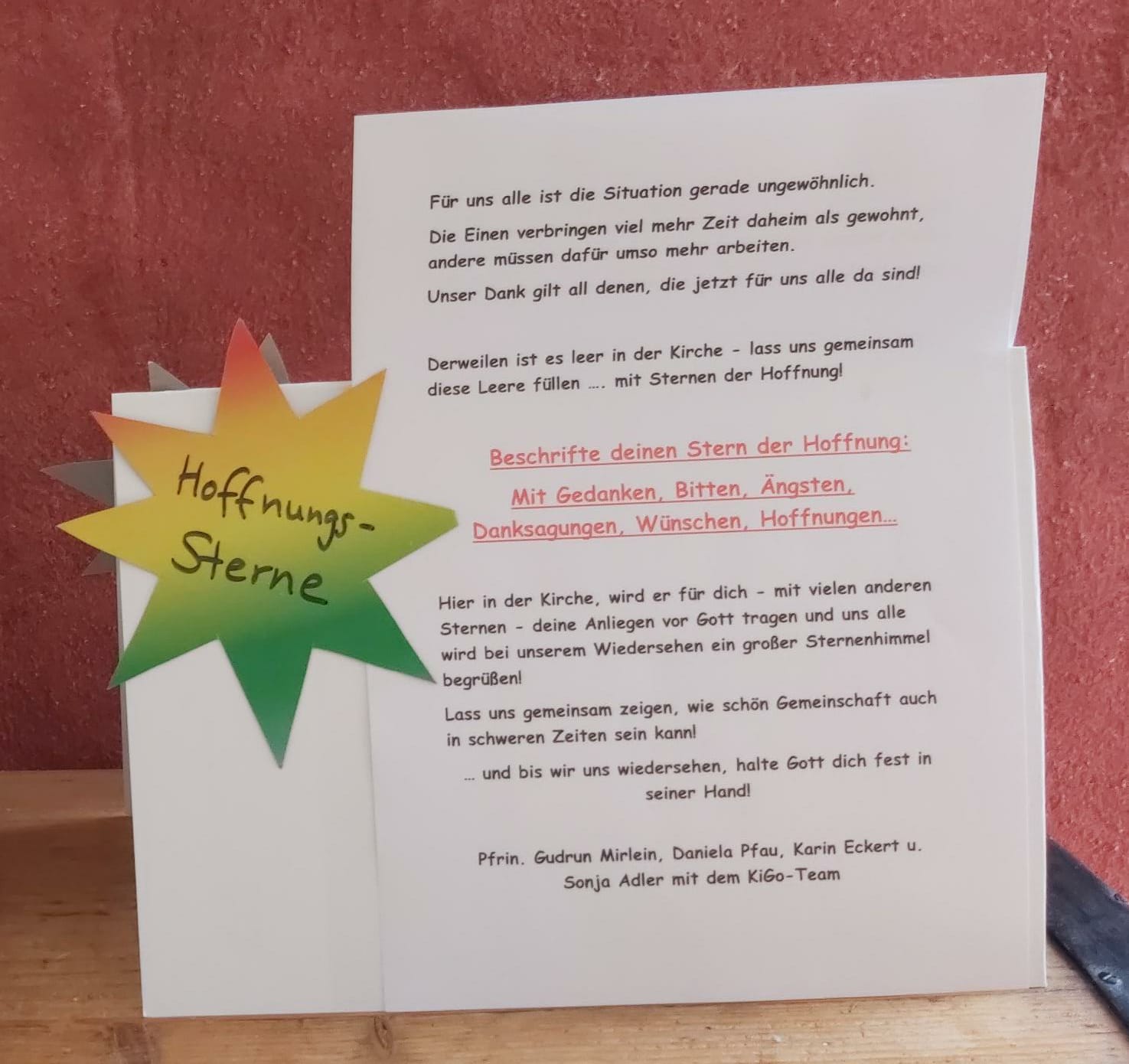 Wir freuen uns auf ganz viele bunte, kreative, emotionale Hoffnungs-Sterne – diese werden in der Kirche, für uns unsere Bitten und Ängste vor Gott tragen und uns alle wird bei unserem Wiedersehen ein großer Sternenhimmel begrüßen! Lasst uns gemeinsam zeigen, wie schön Gemeinschaft auch in schweren Zeiten sein kann! … und bis wir uns wiedersehen, halte Gott dich fest in seiner Hand!