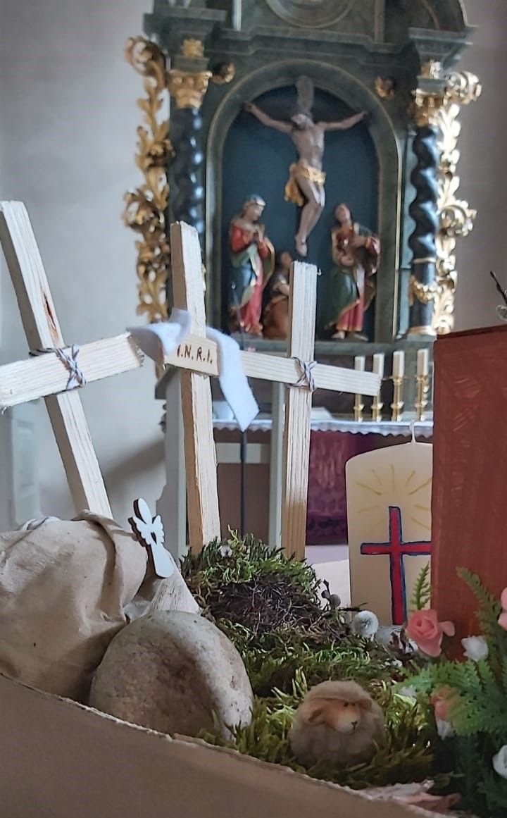 Auf dem Bild oben seht Ihr den Ostergarten in der Kirche, den Elena und Daniela Pfau in der Kirche gestaltet haben.