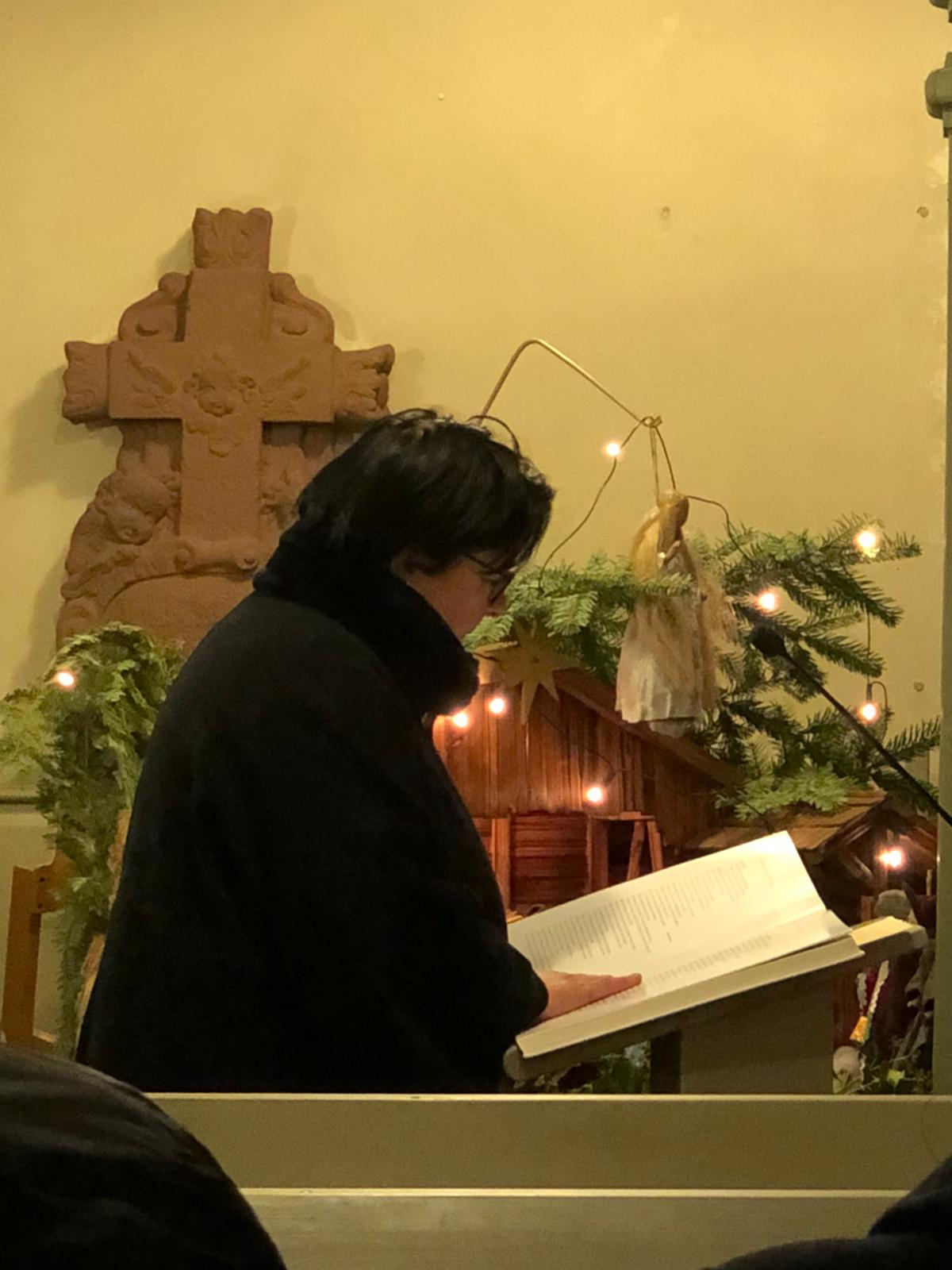 Mit dem ersten Satz aus der Sonate F Dur von Mozart eröffneten Barbara Steiner und Peter Walser die musikalische Andacht. Pfarrerin Mirlein begrüßte danach die ungefähr 40 Besucher mit Psalm 23 und 150 - in einer besonderen Übersetzung von Martin Buber. Der zweite und dritte Satz der Sonate folgten, außerdem die Goldbergvariationen von J.S. Bach sowie Adagio, Allegro, Largo aus der Recercata 1 von G.B. Platti.