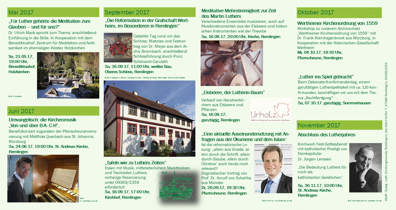 Als Pfarrerin Mirlein im Frühling 2016 den Kirchenvorstand darüber informierte, dass sie einige Ideen habe, wie wir als ur-evangelisches Dorf das Luther-Jubiläumsjahr besonders feiern könnten, ahnte noch keiner, dass Remlingen mit fast 40 Einzelveranstaltungen eine der aktivsten Gemeinde im Dekanat Würzburg sein würde.