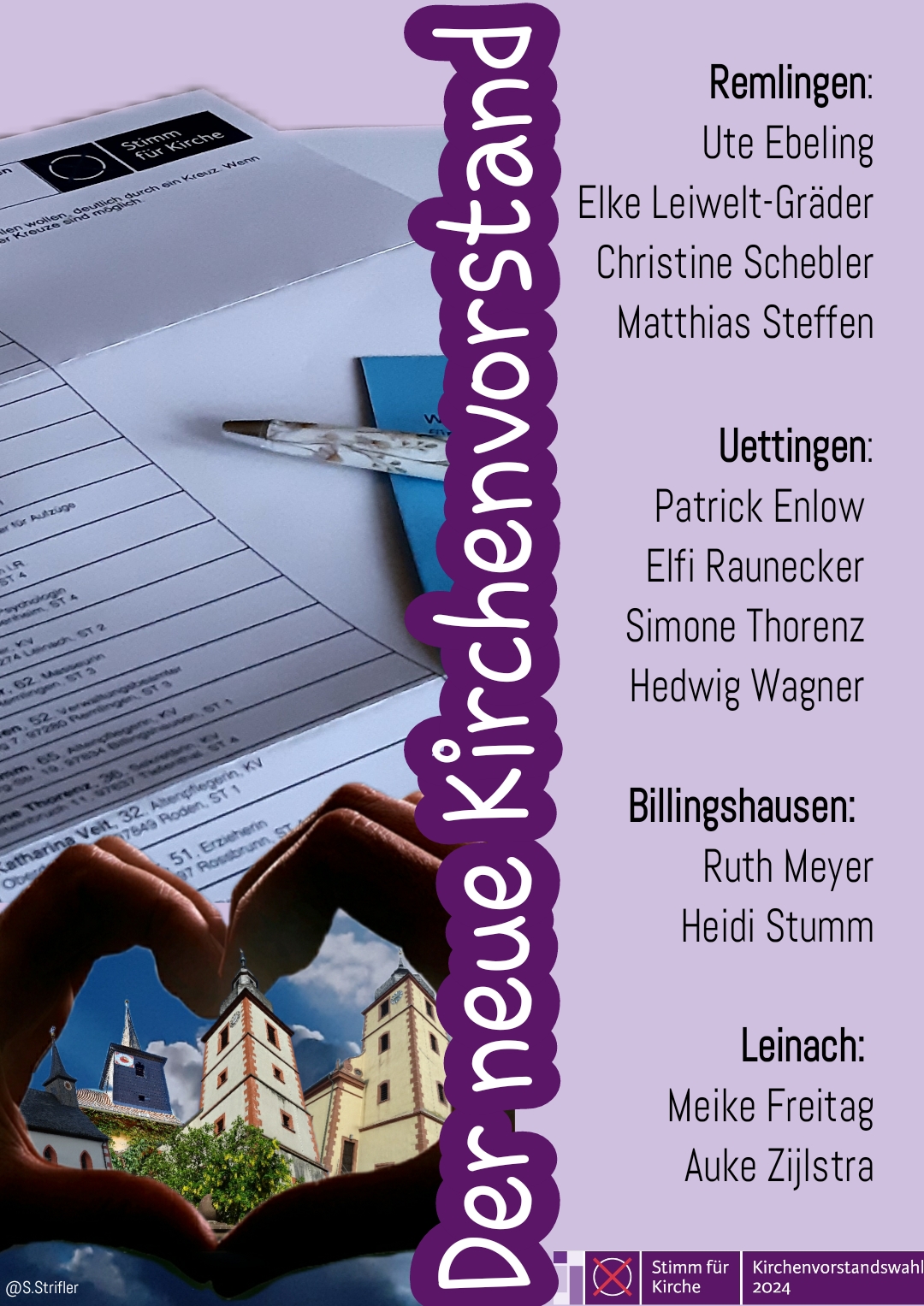 Wir laden Sie ganz herzlich zur Einführung des neuen Kirchenvorstandes im Gottesdienst am 1. Advent um 10.30 Uhr in Remlingen ein. Bitte unterstützen Sie unseren neuen gemeinsamen Kirchenvorstand durch Ihre Teilnahme und Fürbitte.